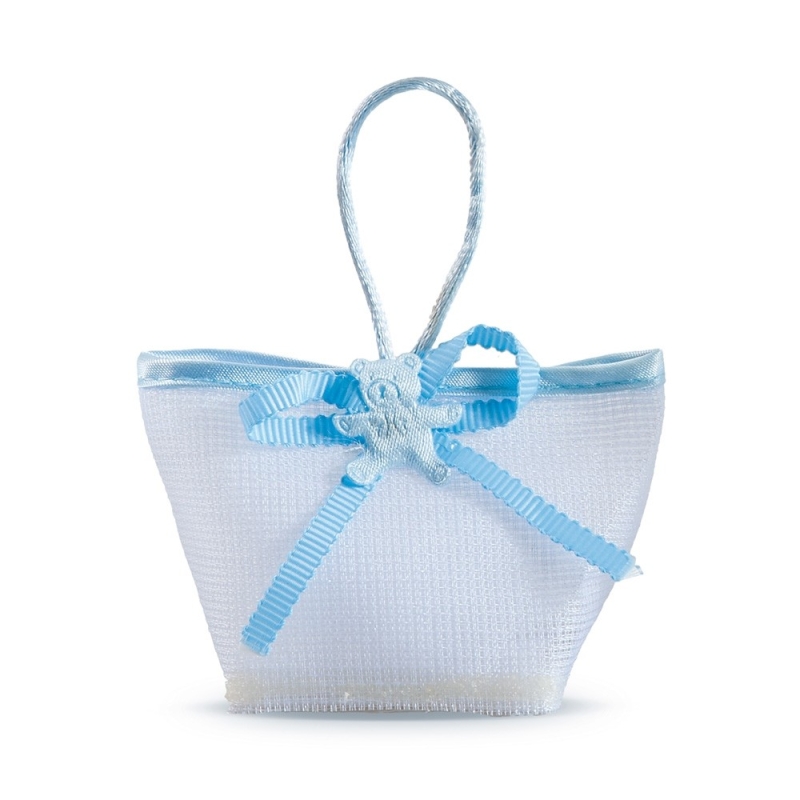 Λινό τσαντάκι με χερούλι σε χρώμα λευκό με σιέλ λεπτομέρειες και αρκουδάκι στο φιόγκο.