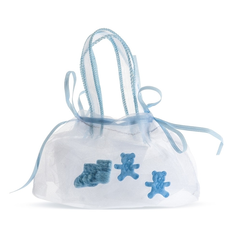 Πουγκί από οργάντζα σε χρώμα λευκό διακοσμημένο με σιέλ αρκουδάκια και χερούλι από κορδέλα.