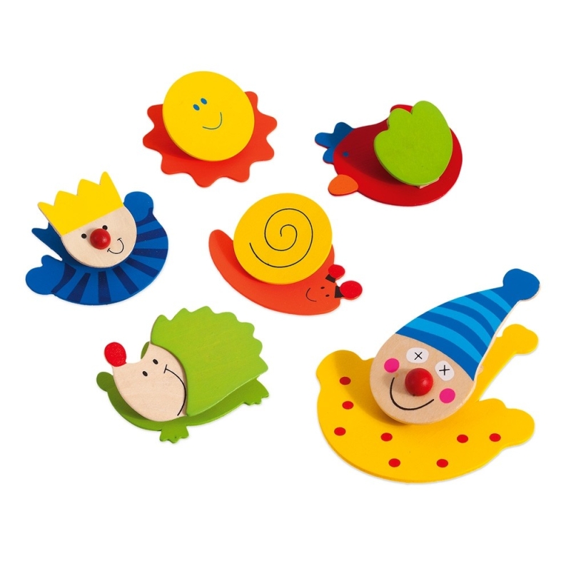 Ξύλινα παιδικά πολύχρωμα μανταλάκια με μαγνήτη σε διάφορα σχέδια. Ο κωδικός περιλαμβάνει 6 σχέδια