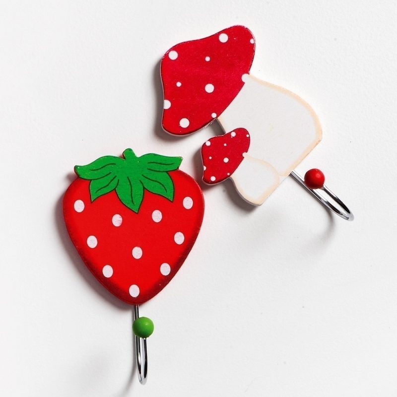 Ξύλινη παιδική κόκκινη κρεμάστρα με σχέδιο φράουλα και μανιτάρι. Ο κωδικός περιλαμβάνει 2 σχέδια