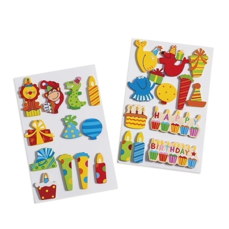 Ξύλινα πολύχρωμα αυτοκόλλητα με διάφορες παιδικές παραστάσεις, ιδανικά για γενέθλια, διακοσμήσεις και κατασκευές. Ο κωδικός περιλαμβάνει 24 σχέδια.