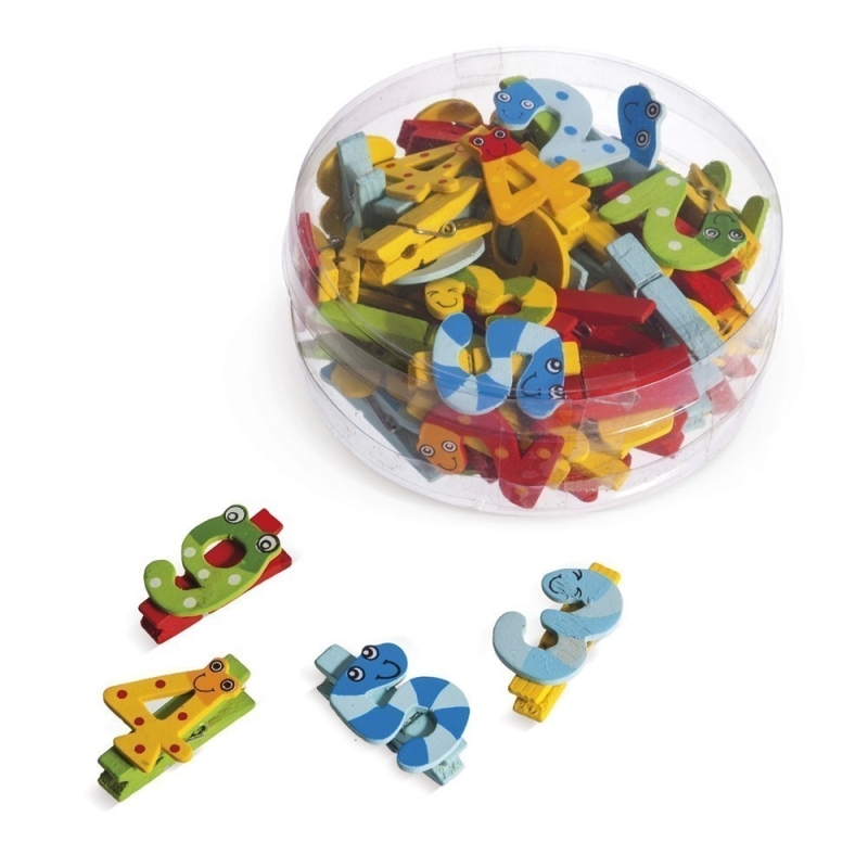 Ξύλινα πολύχρωμα παιδικά μανταλάκια με αριθμούς σε συσκευασία των 40τμχ, ιδανικά για διακοσμήσεις και κατασκευές. Ο κωδικός περιλαμβάνει 10 σχέδια.