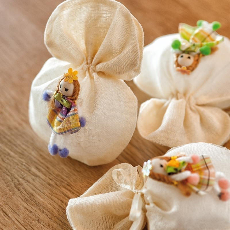 Πουγκί με γλώσσα από γάζα σουρωτό λευκό ή εκρού με κοριτσάκι. Ο κωδικός περιλαμβάνει 5 χρώματα στο κοριτσάκι