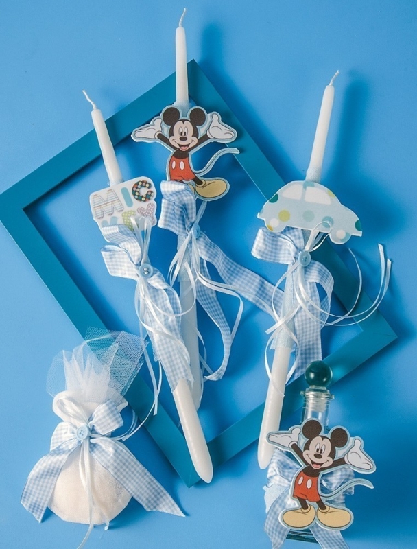 Disney σετ λαδιού σε σιέλ αποχρώσεις στολισμένα με φιγούρα ξύλινη μικρή ολόσωμη του mickey,με αυτοκινητάκι και με ταμπελίτσα μικρή ξύλινη με το όνομα του mickey. Ο κωδικός περιλαμβάνει το μπουκάλι του λαδιού, το σαπούνι μέσα σε πουγκάκι και τα 3 κεράκια, όλα στολισμένα σε σιέλ αποχρώσεις