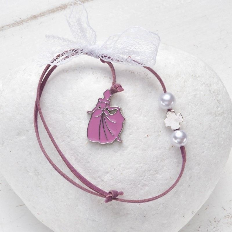 Disney Cinderella μαρτυρικό βραχιόλι λιλά,χυτός σταυρός ασημί με πέρλα και δαντέλα λευκή.