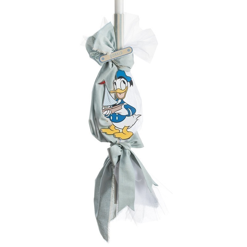 Disney λαμπάδα βάπτισης δεμένη με τούλι και ύφασμα λινό μονόχρωμο σιέλ και ριγέ σιέλ και διακοσμημένη με ξύλινη ολόσωμη φιγούρα του Donald κρατώντας ένα καράβι.Στο πάνω μέρος της λαμπάδας υπάρχει και ξύλινη ταμπελίτσα με το όνομα του Donald.