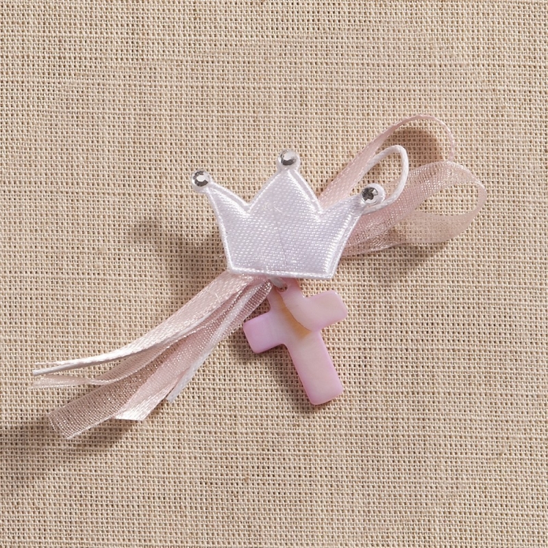 Μαρτυρικό με φίλντισι ροζ δεμένο με κορδέλα οργάντζα και σατέν ροζ και διακοσμημένο με υφασμάτινη κορωνίτσα λευκή.
