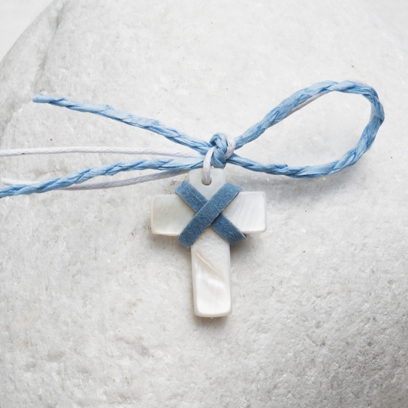 Μαρτυρικό με φίλντισι σταυρό λευκό και κορδόνι σιέλ.