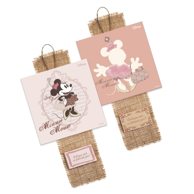Disney ξύλινο κρεμαστό καδράκι με λινάτσα. Είναι διακοσμημένο με ξύλινη παράσταση vintage print Minnie mouse Style queen σε αποχρώσεις του ροζ. Συνοδεύεται από ξύλινο μικρό ταμπελάκι όπου δίνεται η δυνατότητα να γραφτεί η ευχή σας (Ενθύμιο από την βάπτισή μου ή Σας ευχαριστώ ή Όνομα του παιδιού). Ο κωδικός περιλαμβάνει 2 σχέδια. Το καδράκι διατίθεται και με καβαλέτο με κωδικό ΝΑ106/Κ (Καβαλέτο:12x20cm) και περιλαμβάνει και τα 2 σχέδια.