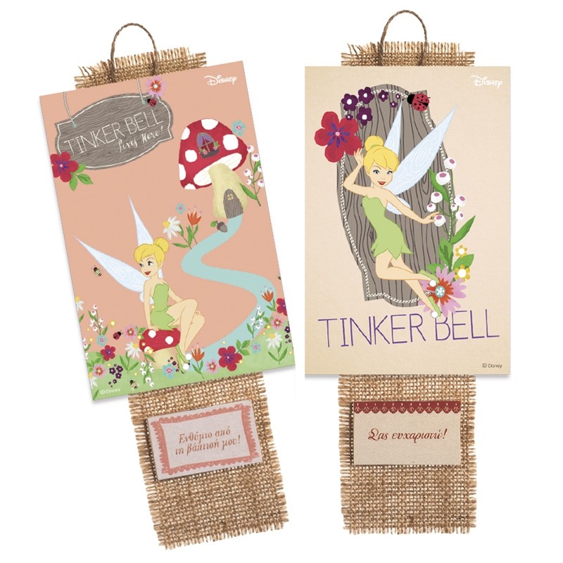 Disney ξύλινο διακοσμητικό καδράκι κρεμαστό με λινάτσα ,print με παιδική παράσταση tinkerbell, το λογότυπο της disney και καρτελάκι με τη φράση Ενθύμιο από τη βάπτισή μου ή Σας ευχαριστώ. Ο κωδικός περιλαμβάνει 2 σχέδια.