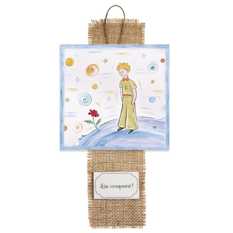 Ξύλινο διακοσμητικό καδράκι κρεμαστό με λινάτσα ,print με παράσταση μικρού πρίγκιπα και καρτελάκι με τη φράση Σας ευχαριστώ σε απόχρωση σιέλ.