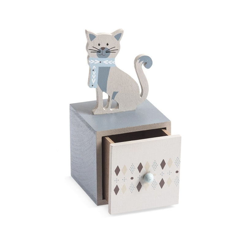 Ξύλινο συρταράκι σε σιελ χρώμα. Πάνω κάθεται μια γατούλα άσπρη με σιελ λεπτομέρειες.
