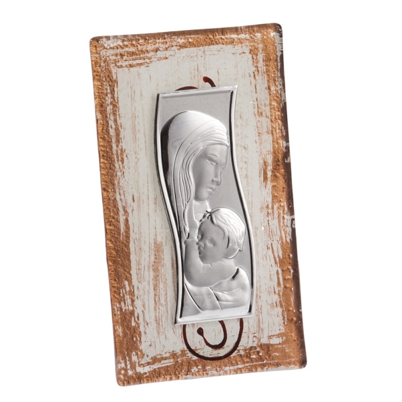 Γυάλινη καφέ κορνίζα με τη φιγούρα της Παναγίας με το Χριστό σε ασημί μέταλλο. Το αντικείμενο συνοδεύεται από χάρτινο κουτάκι δώρου.