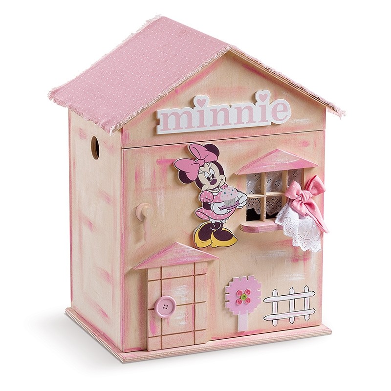 Disney ξύλινο natural σπιτάκι-ντουλαπάκι με πορτούλα και παραθυράκι, συσκευασία βάπτισης ζωγραφισμένη στο χέρι με θέμα το σπίτι της minnie σε ροζ αποχρώσεις. Η σκεπή είναι ντυμένη με ύφασμα ροζ πουά και στο μπροστινό μέρος του κουτιού στέκεται η ξύλινη φιγούρα της minnie οικοδέσποινας έτοιμη να προσφέρει το γλυκάκι της ,ενώ την κορυφή του σπιτιού διακοσμεί ξύλινη ταμπελίτσα με το όνομα της 'minnie'