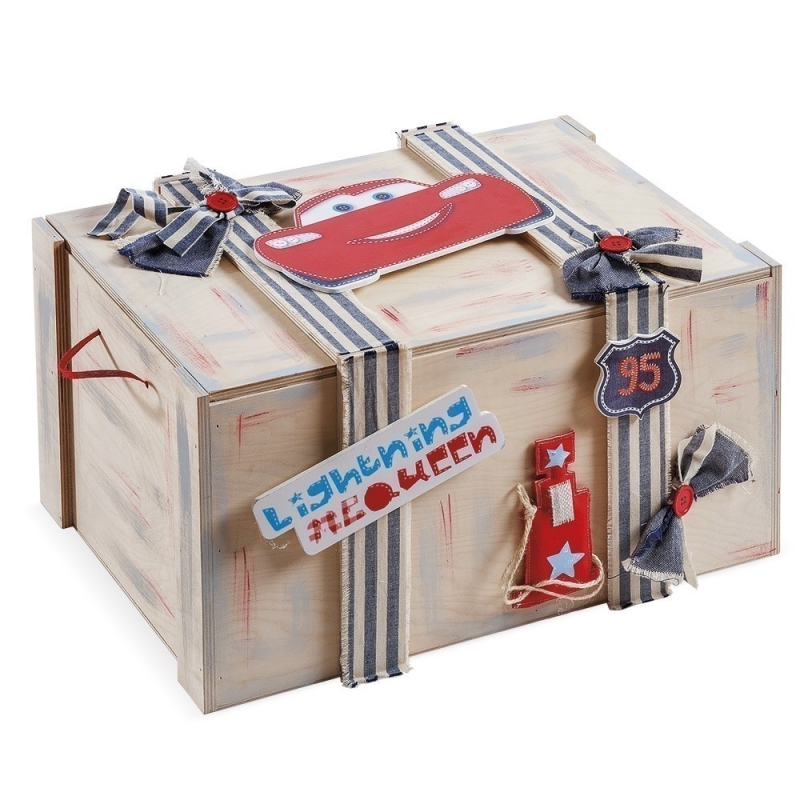 Disney ξύλινη natural κασέλα-παλέτα, συσκευασία βάπτισης ζωγραφισμένη στο χέρι με σβησίματα γκρι-κόκκινα, στολισμένη με ριγέ και μονόχρωμο ύφασμα σε αποχρώσεις μπλε και κόκκινες . Το καπάκι του κουτιού είναι διακοσμημένο με την ξύλινη φιγούρα του McQueen,ενώ το μπροστινό μέρος του κουτιού διακοσμεί ξύλινη ταμπελίτσα πάνω στην οποία αναγράφεται το όνομά του Lightning McQueen μαζί με το ξύλινο σηματάκι του αντίστοιχα.