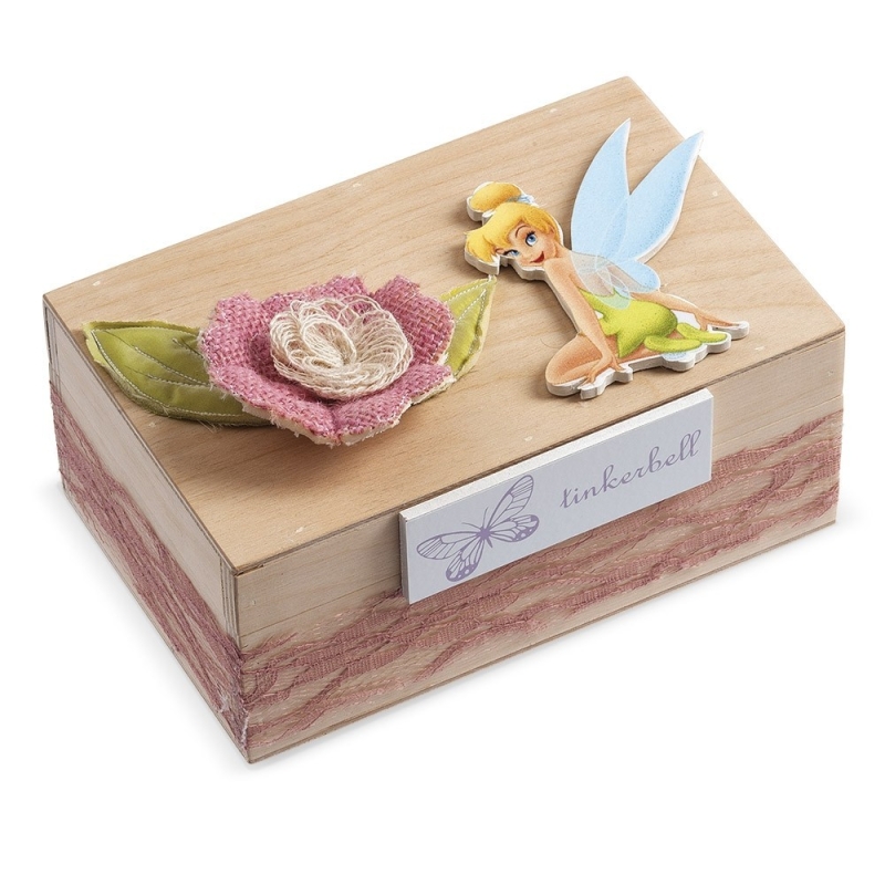 Disney ξύλινο natural κουτί μαρτυρικών, διακοσμημένο με ξύλινη ολόσωμη φιγούρα της Tinkerbell γονατιστή δίπλα σε χειροποίητο νούφαρο. Το κουτί γύρω γύρω είναι διακοσμημένο με λωρίδα δαντέλας σε σάπιο μήλο χρώμα και στο καπάκι μπροστά υπάρχει ξύλινη ταμπελίτσα με το όνομα της Tinkerbell σε λιλά χρώμα