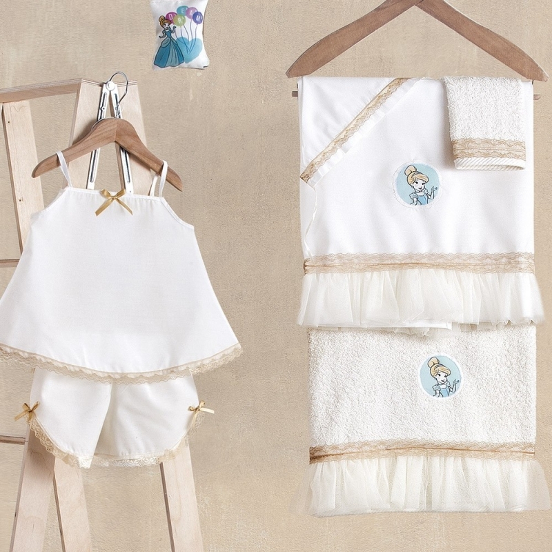 Disney σετ λαδόπανα βάπτισης σε εκρού χρώμα με σχέδιο τη Cinderella. Στο σετ περιλαμβάνεται το λαδόπανο, τα εσώρουχα,η πετσέτα η μεγάλη και η μικρή των χεριών