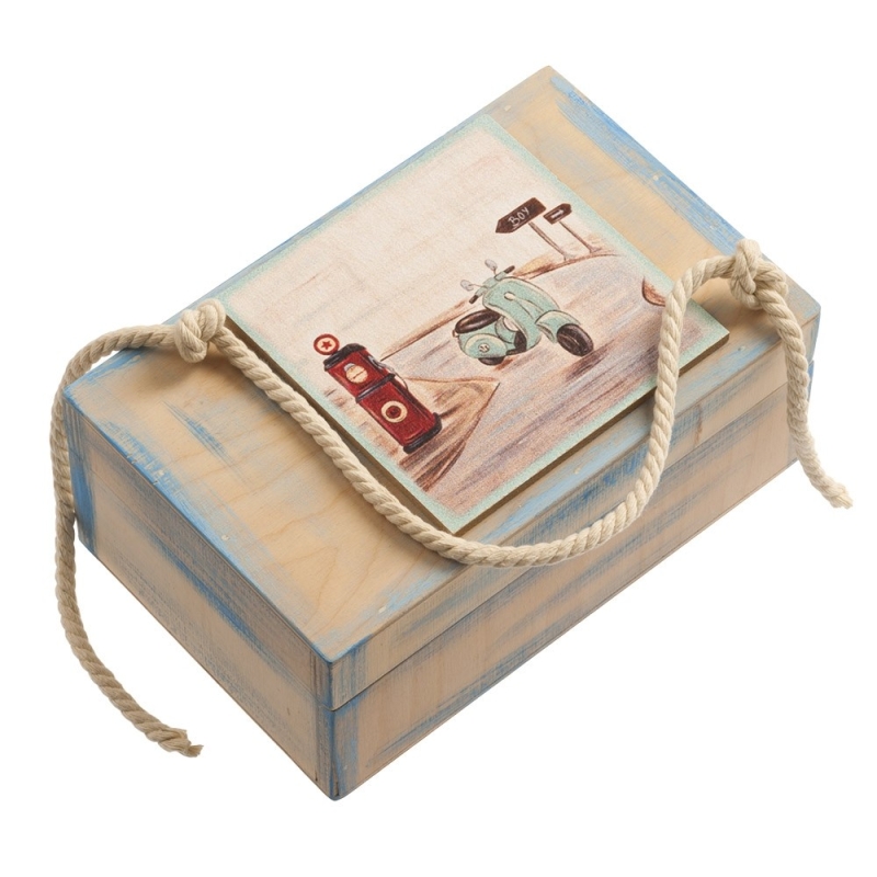 Ξύλινο natural κουτί μαρτυρικών, διακοσμημένο με ξύλινο καδράκι που απεικονίζει μία βεραμάν βέσπα δίπλα σε μία κόκκινη αντλία βενζίνης και με κορδόνι εκρού. Όλο το κουτί έχει σβησίματα σε μπεζ-σιέλ αποχρώσεις