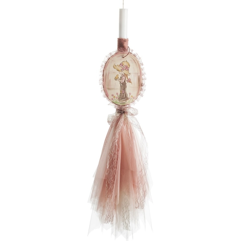 Λαμπάδα βάπτισης, τυλιγμένη με κορδόνι σε σάπιο μήλο χρώμα, δεμένη με τούλι ριχτό ανάλαφρα και δαντέλα κορδέλα σε χρώμα εκρού και σάπιο μήλο.Τη λαμπάδα διακοσμεί επίσης ξύλινο οβάλ καδράκι που απεικονίζει τη Sarah Kay να στέκεται ανάμεσα σε πολύχρωμα λουλούδια κρατώντας ένα πουλάκι και παίζοντας μαζί του.