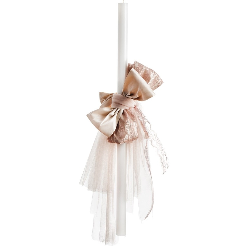 Λαμπάδα βάπτισης δεμένη με τούλι και διακοσμημένη με φιόγκο από ταφτά σομόν και δαντέλα σάπιο μήλο