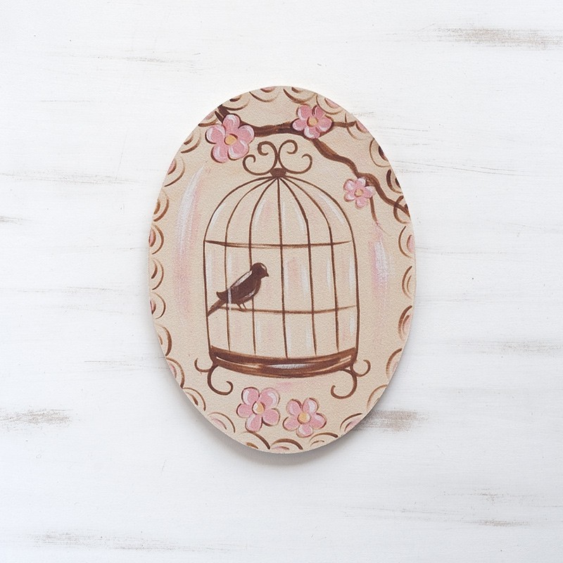 Ξύλινο οβάλ καδράκι natural με κλουβί και πουλάκι με σβησίματα ροζ, ιδανικό για διακοσμήσεις και κατασκευές