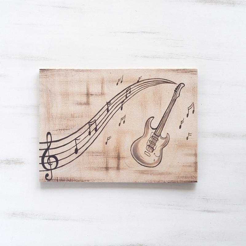 Ξύλινο καδράκι natural παραλληλόγραμμο με σβησίματα καφέ,με κιθάρα και μουσικό πεντάγραμμο, ιδανικό για διακοσμήσεις και κατασκευές