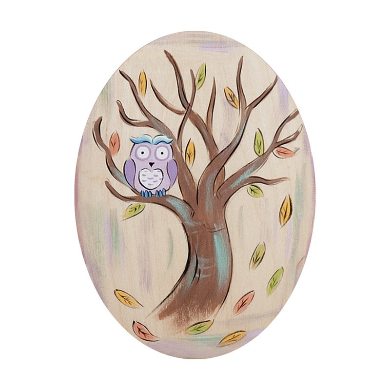 Ξύλινο οβάλ καδράκι natural με το δέντρο της σοφίας και την κουκουβάγια πάνω με λιλά-βεραμάν σβησίματα, ιδανικό για διακοσμήσεις και κατασκευές