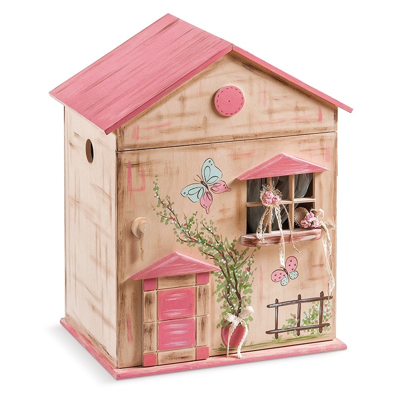 Ξύλινο natural σπιτάκι-ντουλαπάκι με πορτούλα και παραθυράκι σε ροζ αποχρώσεις, συσκευασία βάπτισης ζωγραφισμένη στο χέρι με θέμα πολύχρωμες πεταλούδες. Η σκεπή είναι βαμμένη ροζ και όλο το κουτί έχει σβησίματα σε ροζ-καφέ αποχρώσεις