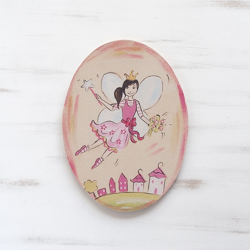 Ξύλινο οβάλ καδράκι natural με νεράιδα και σβησίματα ροζ, ιδανικό για διακοσμήσεις και κατασκευές