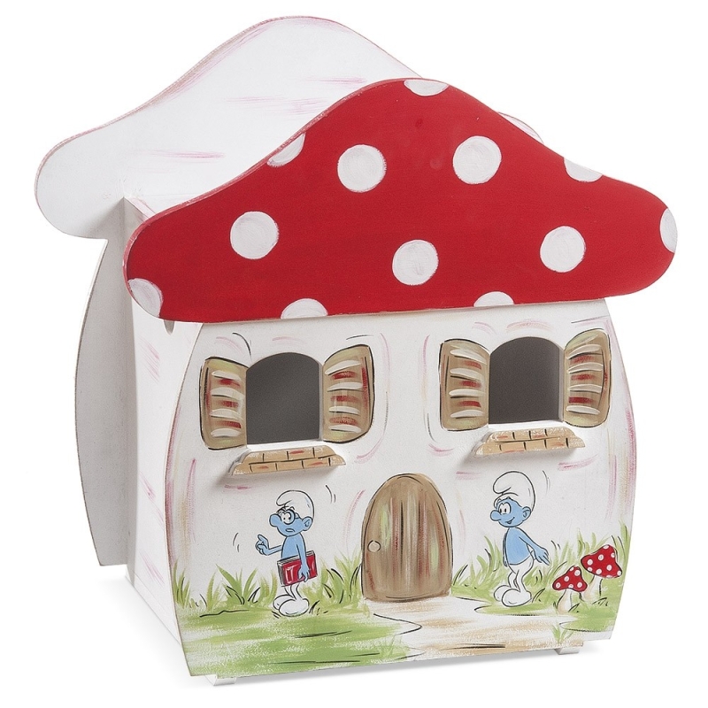Ξύλινο μανιταρόσπιτο, συσκευασία βάπτισης ζωγραφισμένη στο χέρι με θέμα το στρουμφοχωριό. Η σκεπή του σπιτιού είναι ζωγραφισμένη κόκκινη με λευκά πουά και στο μπροστινό μέρος του κουτιού είναι ζωγραφισμένα στρουμφάκια