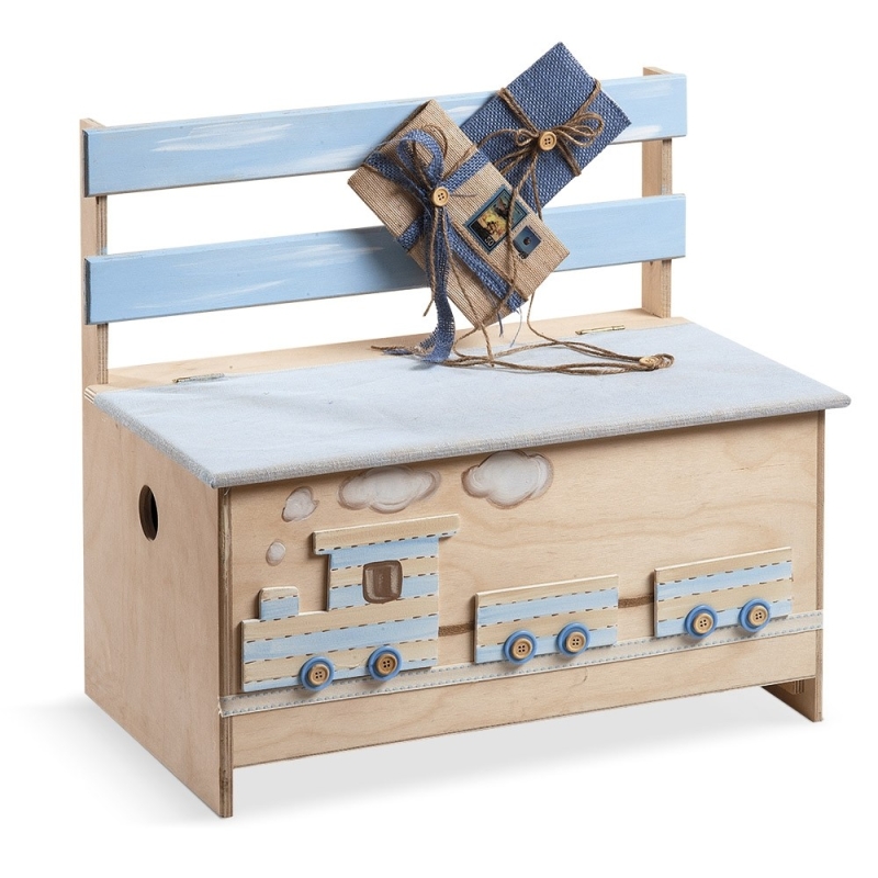 Ξύλινο natural παγκάκι, συσκευασία βάπτισης ζωγραφισμένη στο χέρι με τρενάκι με βαγόνια σε αποχρώσεις μπεζ-σιέλ. Η πλάτη του κουτιού είναι ζωγραφισμένη σιέλ και διακοσμημένη με λινούς φακέλους μπλε και μπεζ και το καθισματάκι είναι ντυμένο με ύφασμα σιέλ