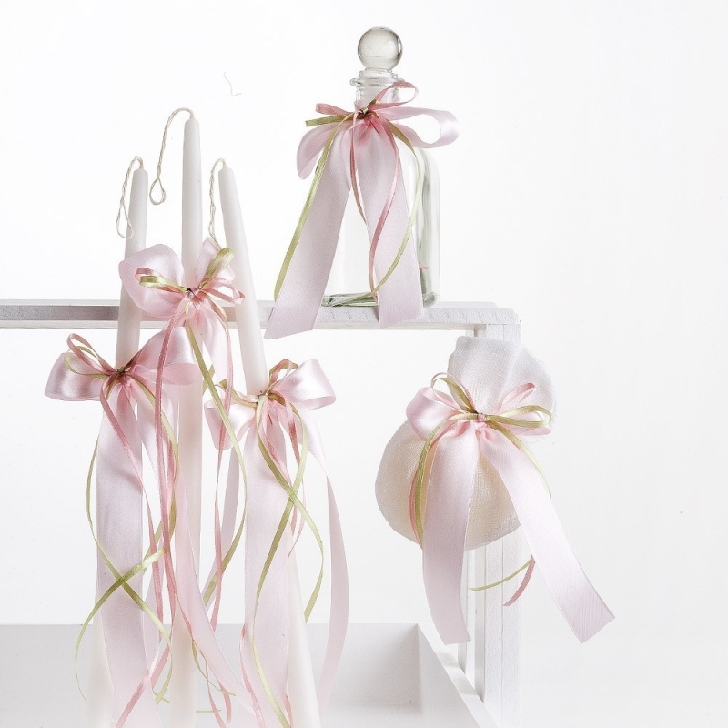 Σετ λαδιού σε ροζ-βεραμάν αποχρώσεις, στολισμένα με κορδέλες σατέν.