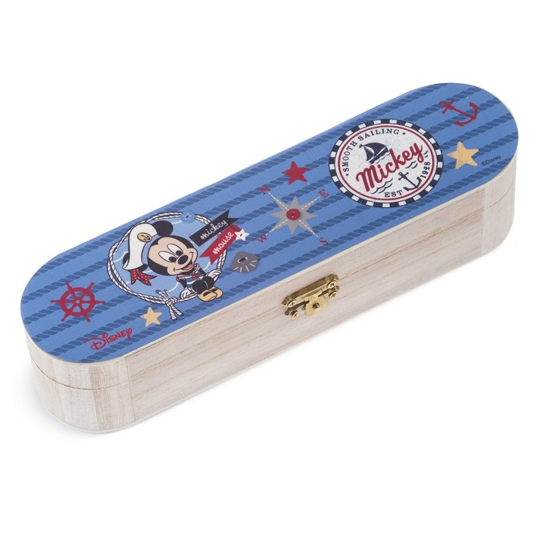 Disney ξύλινη natural κασετίνα με μεταλλικό κούμπωμα. Είναι διακοσμημένη με αυτοκόλλητο print Mickey mouse Smooth sailing σε αποχρώσεις του μπλε.