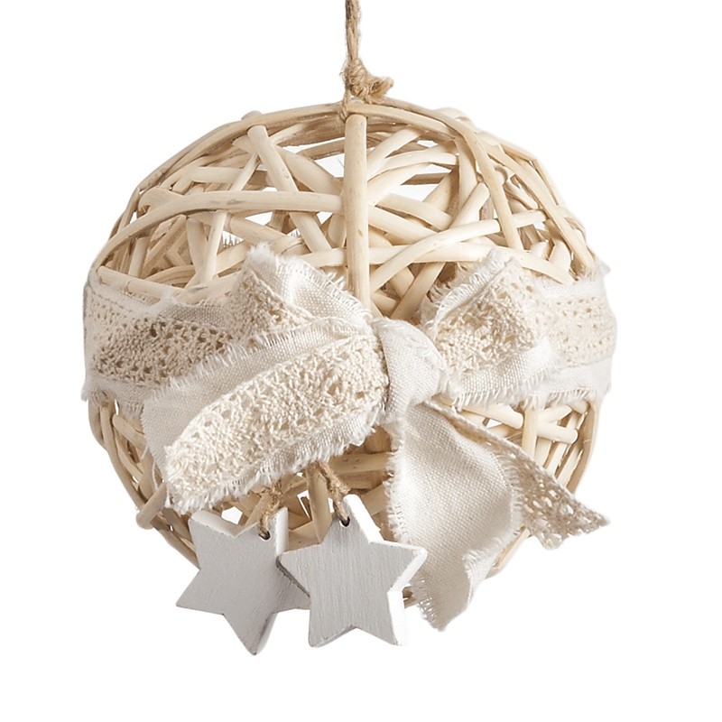 Διακοσμητική κρεμαστή μπάλα από ξύλο μπαμπού σε εκρού χρώμα με φιόγκο από βαμβακερή δαντέλα και κρεμαστά ξύλινα λευκά αστέρια. Ιδανική για διακόσμηση.