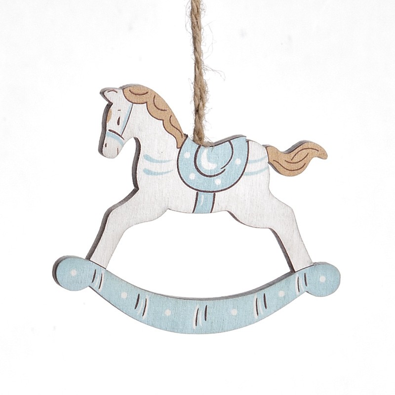 Ξύλινο κρεμαστό αλογάκι σε λευκό με σιελ χρώμα. Η χαίτη και η ουρά είναι σε καφέ χρώμα.