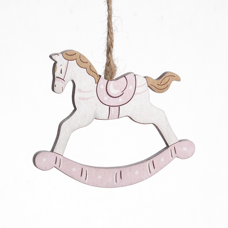 Ξύλινο κρεμαστό αλογάκι σε λευκό με ροζ χρώμα. Η χαίτη και η ουρά είναι σε καφέ χρώμα.