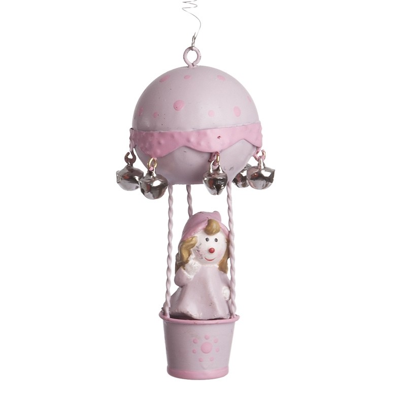 Μεταλλικό κρεμαστό αερόστατο μέσα στο οποίο υπάρχει ένα κοριτσάκι. Το αερόστατο είναι ροζ με κουδουνάκια και κρέμεται από ένα ελατήριο.