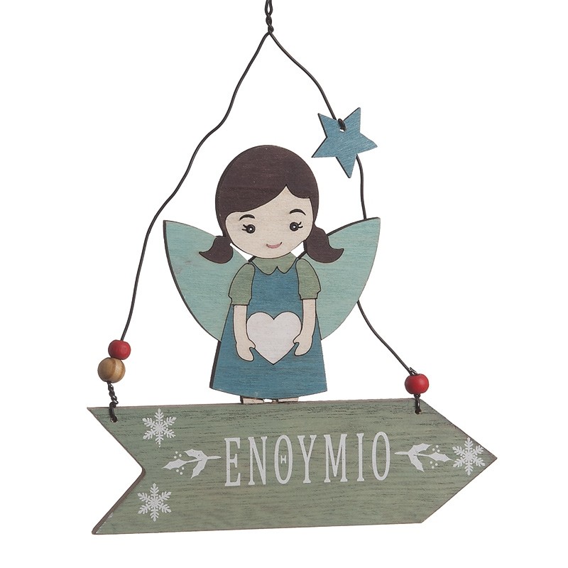 Ξύλινο κρεμαστό τόξο που αναγράφει τη λέξη ΕΝΘΥΜΙΟ. Πάνω στο τόξο υπάρχει ένα αγγελάκι σε πράσινο χρώμα. Το σύρμα με το οποίο κρεμιέται είναι διακοσμημένο με χαντρούλες και αστέρι.