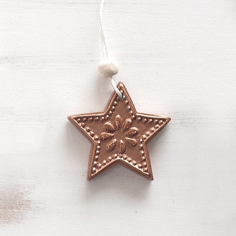 Πολυεστερικό διακοσμητικό κρεμαστό αστέρι σε χρώμα bronze με μια ξύλινη natural χάντρα στο σκοινάκι. Ιδανικό για Χριστουγεννιάτικη διακόσμηση