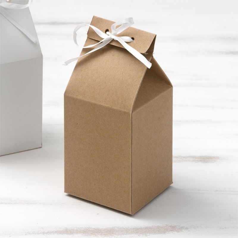 Χάρτινο κουτάκι milk box σε kraft χρώη συσκευασία βρίσκεται ασυναρμολόγητο με σατέν κορδελίτσα.