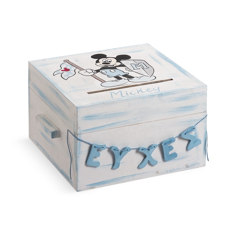 Ξύλινο τετράγωνο κουτί ευχών, ζωγραφισμένο στο χέρι με τον Mickey ιππότη και με σβησίματα σιέλ