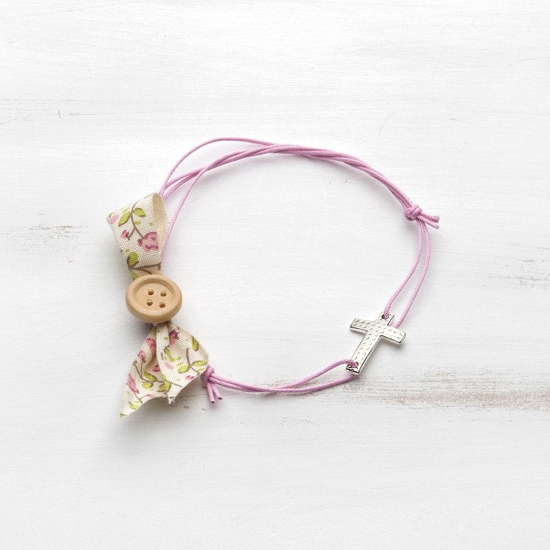 Μαρτυρικό βραχιόλι ροζ με σταυρό χυτό ασημί,floral κορδέλα και κουμπί.