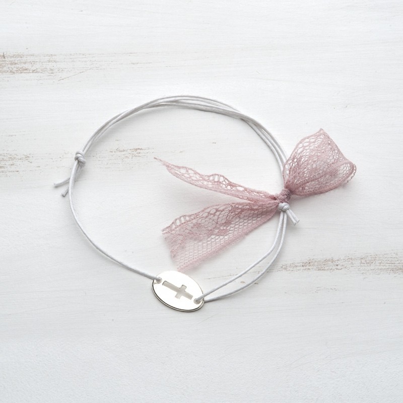 Μαρτυρικό βραχιόλι λευκό με χυτό σταυρό ασημί και δεμένο με δαντέλα σάπιο μήλο.