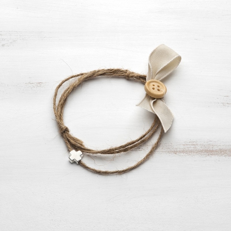 Μαρτυρικό βραχιόλι με σπάγγο καφέ και σταυρό χυτό ασημί, δεμένο με κορδέλα λινή εκρού και κουμπί.