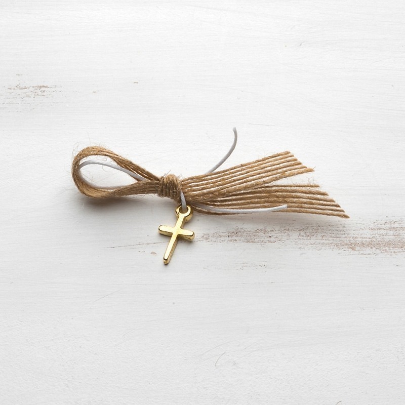 Μαρτυρικό με επίχρυσο σταυρό,κορδέλα γιούτα καφέ και κερωμένο κορδόνι .