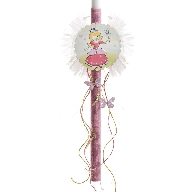Λαμπάδα βάπτισης ντυμένη με ροζ λινάτσα και διακοσμημένη με ξύλινο στρογγυλό καδράκι με πριγκίπισσα πάνω σε φόντο βεραμάν. Το καδράκι είναι διακοσμημένο από πίσω με τούλι και κρέμονται από αυτό κορδόνια ροζ-βεραμάν και πεταλούδες ροζ