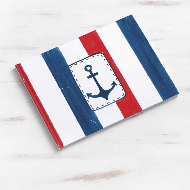Βιβλίο ευχών λευκό εξωτερικά από χοντρό χαρτόνι, ζωγραφισμένο στο χέρι σε ναυτικό στυλ με ρίγες μπλε-λευκές-κόκκινες και με άγκυρα μπλε μέσα σε λευκό πλαίσιο