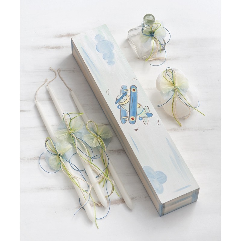 Ξύλινο κουτί συσκευασίας παραλληλόγραμμο ζωγραφισμένο στο χέρι με αεροπλάνο σε χρώμα βεραμάν-σιέλ να φαίνεται πως πετάει φηλά στον ουρανό ανάμεσα στα σύννεφα . Ο κωδικός περιλαμβάνει τα 3 κεράκια, το σαπούνι μέσα σε πουγκάκι και το μπουκάλι του λαδιού, όλα στολισμένα σε βεραμάν-σιέλ-κίτρινες αποχρώσεις