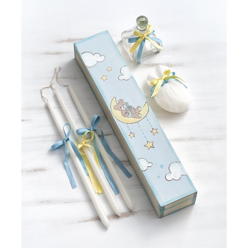Κουτί συσκευασίας παραλληλόγραμμο σιέλ με θέμα το αρκουδάκι ξαπλωμένο πάνω σε φεγγαράκι,ανάμεσα σε σύννεφα και αστεράκια με σβησίματα σιέλ-κίτρινα. Ο κωδικός περιλαμβάνει τα 3 κεράκια, το σαπούνι μέσα σε πουγκάκι και το μπουκάλι του λαδιού, όλα στολισμένα σε σιέλ-κίτρινες αποχρώσεις