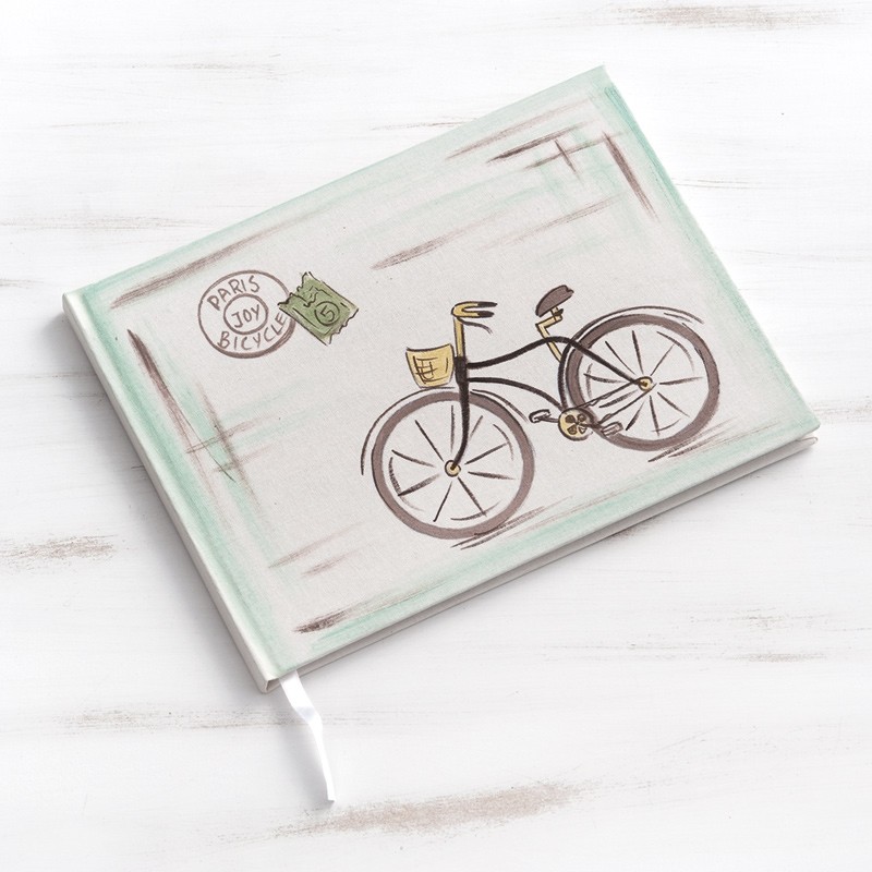 Βιβλίο ευχών λευκό εξωτερικά από χοντρό χαρτόνι, ζωγραφισμένο στο χέρι με ποδήλατο σε αποχρώσεις βεραμάν-καφέ